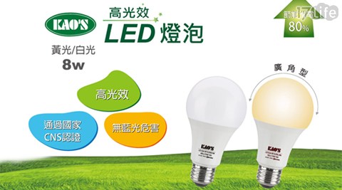平均最低只要79元起(含運)即可享有【KAO'S】高光效LED燈泡全電壓廣角型(8W):6入/12入/24入/48入,款式:白光/黃光?