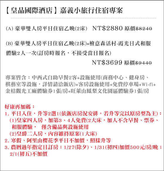 只要2,880元(二~四人價)起即可享有【皇品國際酒店】原價最高9,440元嘉義小旅行住宿專案:(A)豪華雙人房平日住宿乙晚(2床)/(B)豪華雙人房平日住宿乙晚(2床)+檜意森活村-霞光日式和服體驗2人一次(訂房時報名,不接受當日報名),專案皆含:中西式自助早餐2客+設施使用(商務中心、健身房、棋藝室等設施,詳情請洽飯店)+客房設施使用+免費停車場+Wi-fi+金桔觀光工廠體驗劵1張/房+旺萊山鳳梨文化園區體驗劵1張/房。好康再加碼:1.平日入住升等2選1:(1)皇家四人房,加第3、4人免費(2大床,加人不含早餐、票券、和服體驗,僅含備品與設施使用/(2)皇爵二人房,內容維持原案(1大床)、2.寒假、阿里山櫻花季平日不加價,照樣升等、3.農曆過年指定日訂房:1/27(除夕)、1/31(初四)加價500元/房/晚;2/1(初五)不加價!